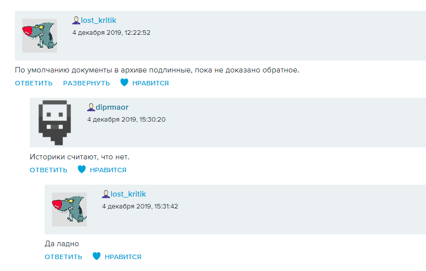 Этот чудак-критик договорился однажды до того, что «по умолчанию документы в архиве подлинные, пока не доказано обратное». Понимаете? Для таких персонажей можно любую портянку заверить печатью женской бани и опубликовать в ФБ, мол, «очередной сверхсекретный документ из архива». И ничего, что с такой логикой можно состряпать, к примеру, докУмент о том, что этот самый Лост-Критик зарубил шашкой Гришку-самозванца на литовской границе. И посадить за убийство. Пусть трупа нет, но докУменты-то — вот они! А там он пусть из тюрьмы потом доказывает его фальшивость.