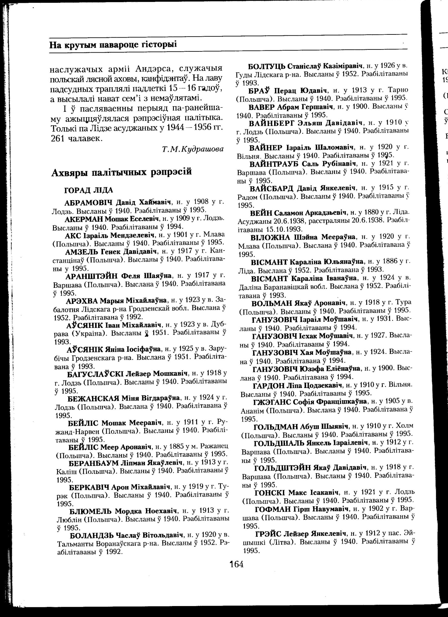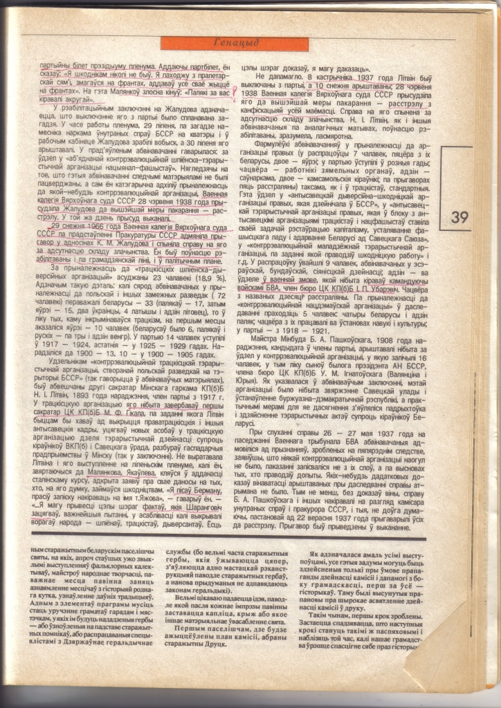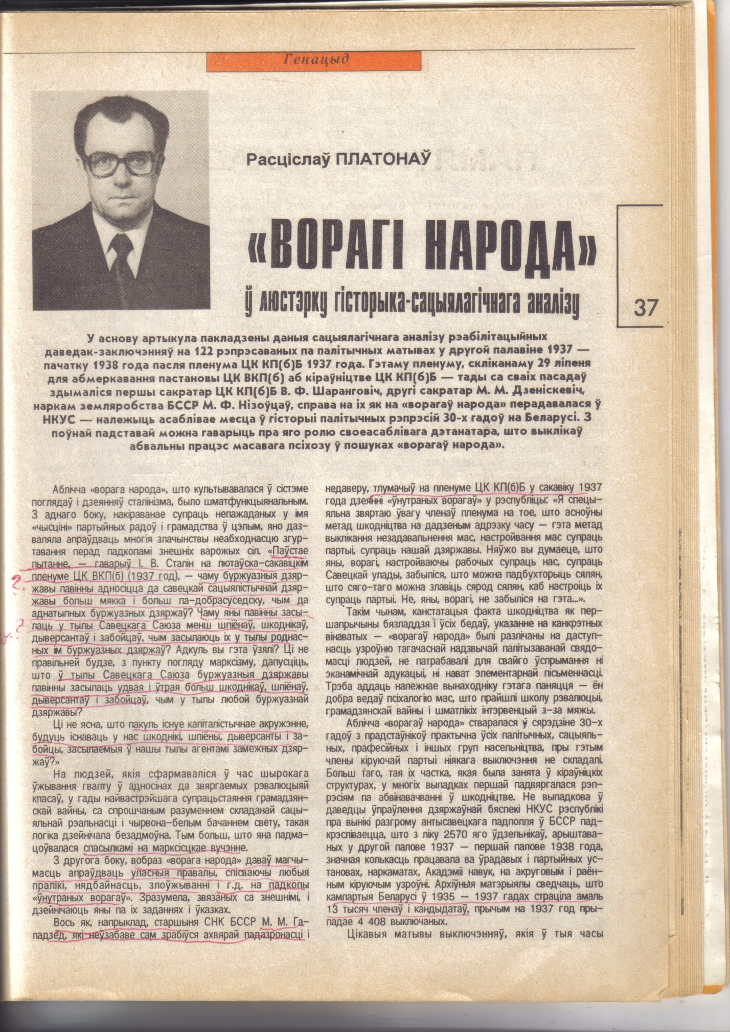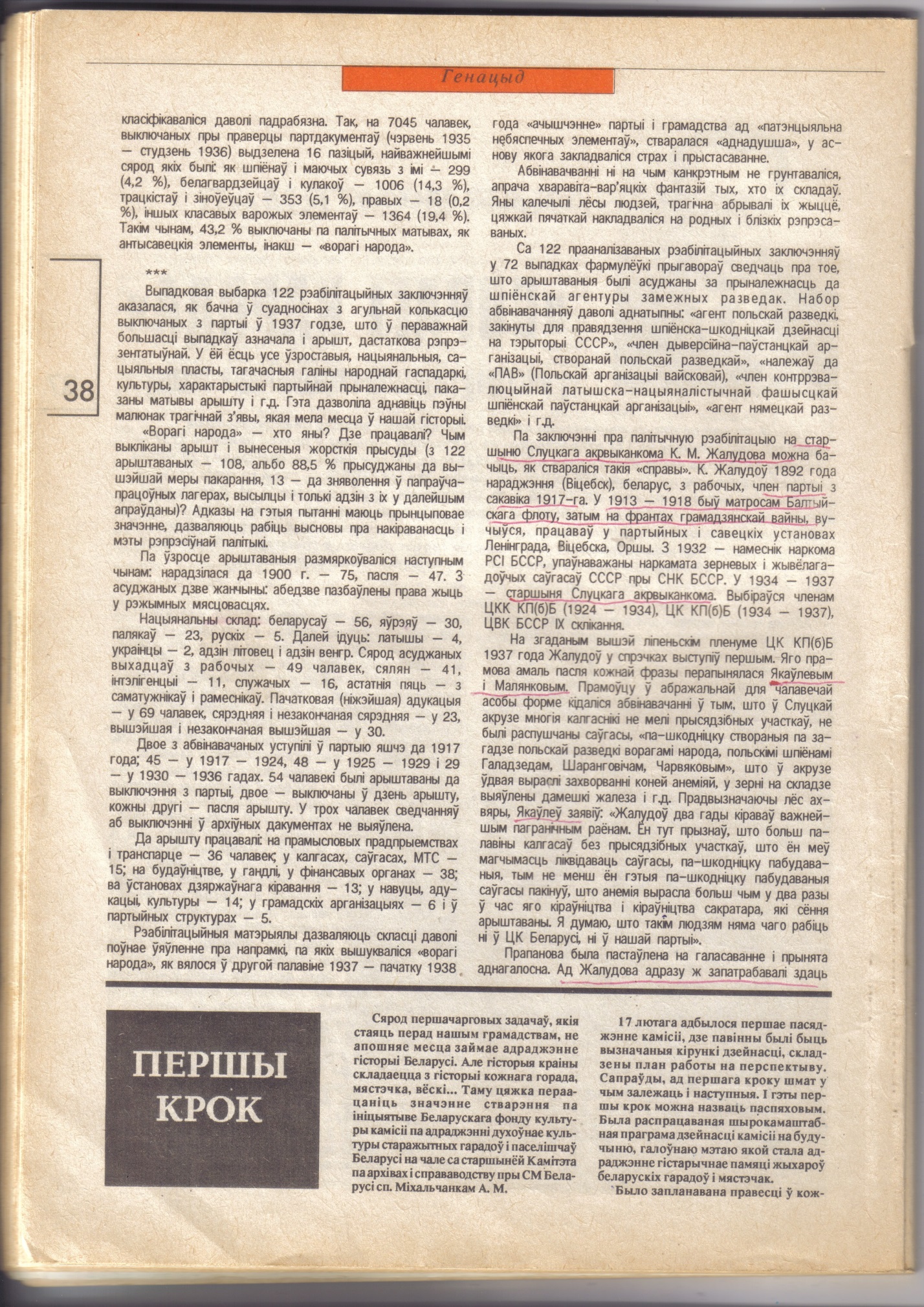 Из приведенных имен в статье, а также из этого отрывка очевидно, что было осуждено много чиновников на высоких должностях в БССР, и в основном все это затронуло Минск (http://katyn.ru/index.php?go=Pages&in=view&id=482). 1170 жителей Минска было расстреляно в 1937–1938 гг. Газету «Вечерний Минск» с именами расстрелянных добыть не сумел, но у меня нет ни малейших сомнений, что приведенные имена в статье Татьяны Протько или сканах журнала, предоставленных мной, – СОВПАДУТ с именами, опубликованными в газете. А вот на 18 687 «расстрелянных» по второй справке из книги Адамушко – найти вряд ли что-то получится. Кроме того, видим, что церковников и сектантов опять нет, что вполне может быть следствием того, что даже эти цифры в 2570 человек по справке «Итоги разгрома ОАП» являются завышенными умышленно.