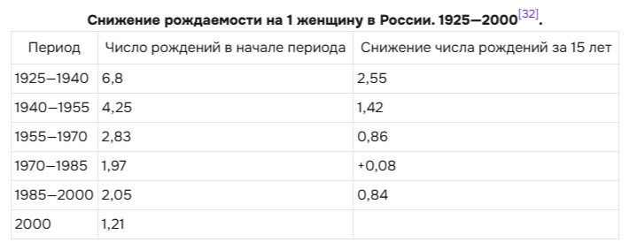 «С 1925 по 2000 год коэффициент суммарной рождаемости в России снизился на 5,59 ребенка в расчете на одну женщину (с 6,80 до 1,21). Из них 3,97 ребенка, или 71% общего снижения приходятся на 1925-1955 годы - “сталинскую эпоху”.