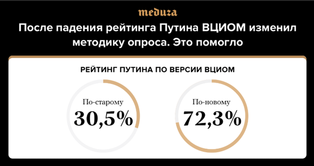 Однако, нам более интересен старый «неправильный» рейтинг. Думаю, мы не ошибемся, если предположим, что и он натянут процентов на пять минимум, – это же ВЦИОМ. Натягивать дальше было бы просто неприлично, поэтому ВЦИОМ объявил о «неправильности» методики и произвел пересчет.