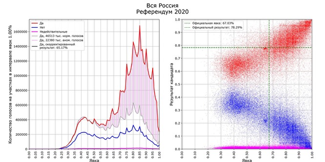Проанализировав голоса 88 млн избирателей, эксперт пришел к выводу, что больше 22 млн голосов можно считать «аномальными». «Если бы манипуляций не было, то явка была бы 42%, высказались за поправки 65%, против — 35%. Проголосовавших за все равно было бы больше, потому как мест, где голосов за было меньше, весьма ограниченное число и они не сделали бы погоды в масштабах страны. Но разница между результатами 65:35 и 78:22 очень существенная, в том числе с политической точки зрения», — считает эксперт.