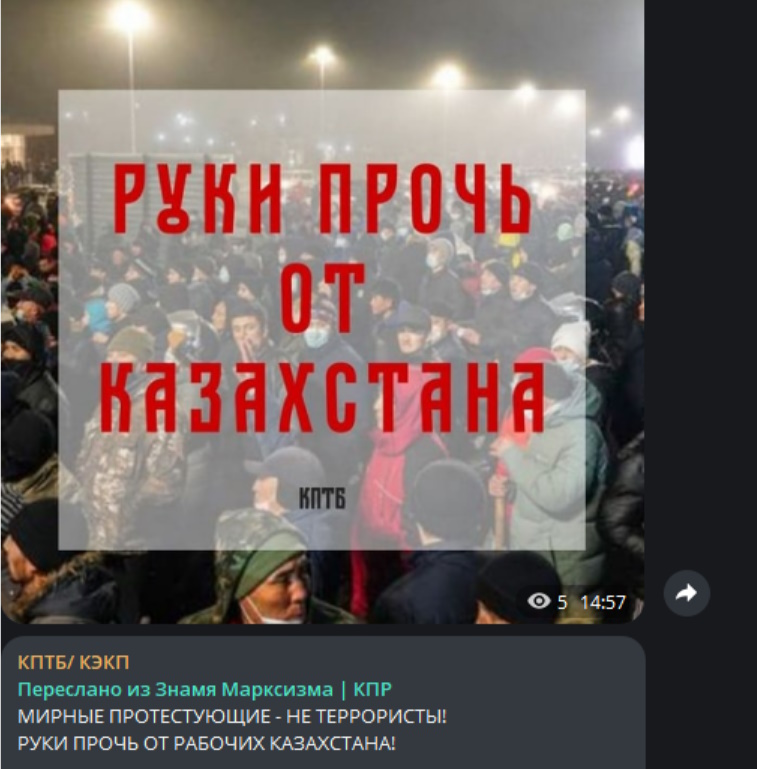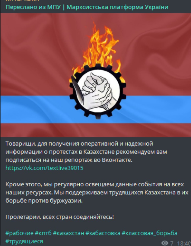 Самое интересное нас ждет при исследовании событий в Казахстане 2022 года. Все помнят массовые беспорядки и попытки организации государственного переворота, когда РФ ввела миротворческие силы для подавления восстания? Да только это не социалистическая революция, а проведение “цветной”. То бишь обыкновенный мятеж. Наша позиция по протестам в Казахстане — строго отрицательная, это работа иностранных специальных служб, а не трудовых масс. Цель - смена одной тряпичной куклы на другую. Но наши “марксисты-ленинцы” из КПТБ выделились и руководствовались методичкой всей либеральной швали, действующей в интересах США. Перевернули всё. Писали, что якобы там отстаивались интересы рабочего. Они даже на агитацию в Казахстан послали работников из России, оплатили им билеты, перевезли за границу, профинансировали. Внимание вопрос. Откуда деньги вы взяли? С пожертвований? Мы уже выяснили, что их у вас нет. Ответ мы получим, если прочтём текст с требованиями, выставленными КПТБ: