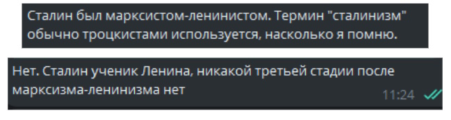 “Позицию я услышал. Подытожим: вы признаете деятельность И.В. Сталина и его работы, а также используете их, как дополнение к марксизму. Но отказываетесь его признавать, как продолжение, наподобие ленинизма, ведь Сталин жил в ту же эпоху, как и Ленин и не мог придумать ничего нового, ведь на дворе империализм. А также из-за троцкистского подтекста, который придали этому учению ревизионистский характер и оскверняют сталинизм, поэтому вы боитесь использовать данный термин.”