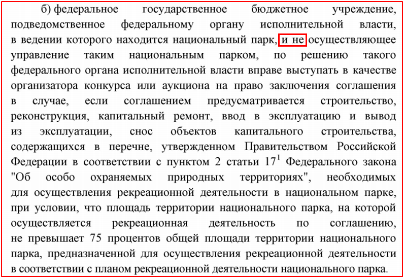 И вроде бы договор заключается с ООПТ – формально это Национальные парки выдают аренду и контролируют управление землёй? Но даже тут ответ «нет». Отрывок из постановления 1432 (Об определении случаев, при которых организатором проведения конкурсов и аукционов на право заключения соглашения об осуществлении рекреационной деятельности в национальном парке может выступать федеральное государственное учреждение), пункт 1б: