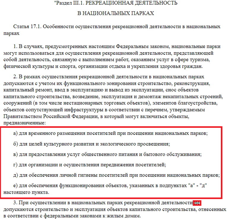 - Согласно пункту 1 статьи 17.3 длительность такого соглашения – а стало быть, и длительность аренды земли – может достигать 49 лет – в случае, если в рамках рекреационного соглашения подразумевается капитальное строительство или ремонт/снос подобных объектов, федеральная земля Национального парка (и мы помним – только в пределах населённого пункта) – может быть предоставлена инвестору в аренду на крайне длительный срок (до 49 лет, ещё раз).