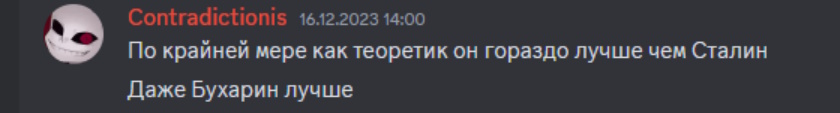 Завязался у меня с этим персонажем и его прихлебалами диалог о “внепартийных бульбуляторах”. С первых сообщений стало понятно — будет интересно. Когда я перевёл дискуссию в разговор о партийном строительстве, то это чудо природы (позже поймете почему) написало, мол я в этом деле не смыслю. Меня это не остановило, следом последовал вопрос моему оппоненту: “Сталина вы читали?” Ответ не заставил себя долго ждать: “Не читал, но может и прочту о национальном вопросе и экономических проблемах в СССР. Но на любую другую тему прочту Троцкого”.
