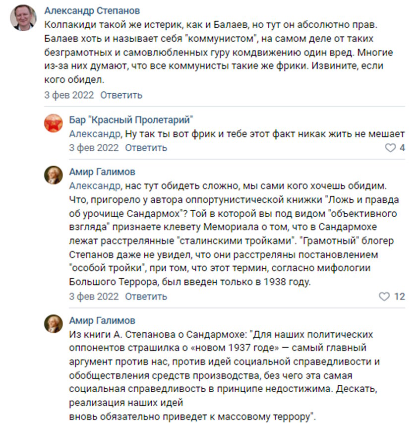 03 февраля 2022 года идеолог «Коммунистов Карелии» пришёл в комментарии к открытому письму П.Г. Балаева в адрес А. Колпакиди 7. Вот скриншоты его заявлений и ответов на них от участников ВК-сообщества нашего движения.