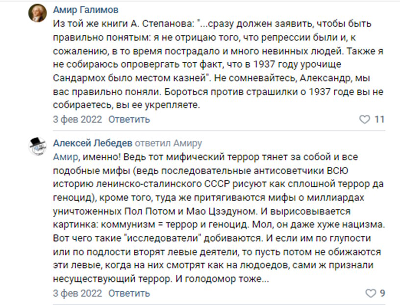 Кстати, попытка Степанова спорить с членами движения завершилась тем же, в чём Степанов обвиняет Балаева. Он перестал отвечать на наши комментарии и «сбежал». Но есть, конечно и разница в этих двух случаях. П.Г. Балаев из вопроса Степанова сразу понял, что Степанов либо не читал исследований Балаева о Сандармохе, либо делает вид, что не читал, ибо ответ на вопрос Степанова там есть. Отвечать на такие вопросы нет никакого смысла. Степанов же просто не имел аргументов для спора с нами и просто исчез из комментариев, а больше чем через год опять вылез с вопросами, на которые давно получил ответ. Видимо он и его тролли так и будут атаковать Балаева и движение одними и теми же вопросами, делая вид, что не замечает получаемых ответов. Поэтому мы могли бы еще долго разбирать ролик Степанова, но не видим в этом никакого смысла.