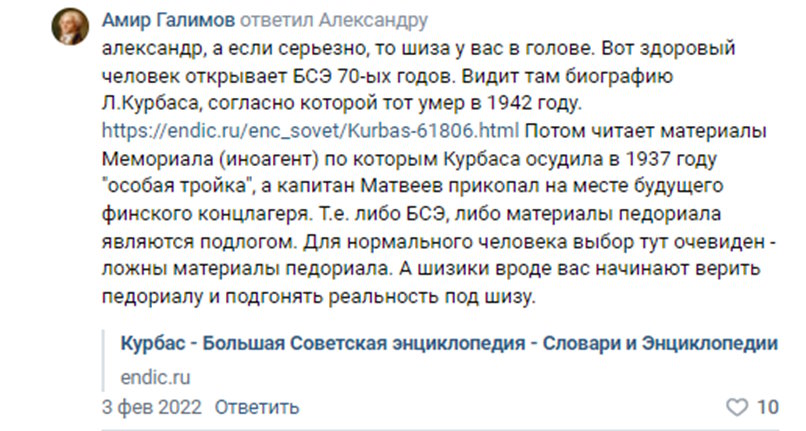 Как можно с лёгкостью заметить, вопросы Степанова в комментариях, заданные в феврале 2022 года, почти полностью повторяют его же вопросы в ролике, снятом в июле 2023 года. При том, что мы еще тогда исчерпывающе ответили ему и на вопрос про расстрелянных чекистов и на вопрос о судьбе заключенных «соловецкого этапа». Ещё один пример плюсом к Вангенгейму – Курбас, о котором БСЭ также сообщает, что он умер в 1942 году, а вовсе не в 1937.